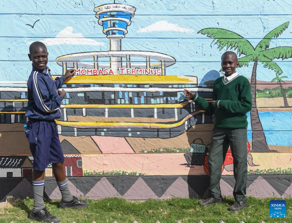Nairóbi, 29 ago (Xinhua) -- Com o rosto radiante de orgulho, Miriabel Aparat, 16 anos, cuidadosamente pintou com tinta fresca um mural gigante de um elegante trem de passageiros deslizando pela Ferrovia de Bitola Padrão Mombasa-Nairóbi (SGR, na sigla em inglês), construída pela China, no Quênia.