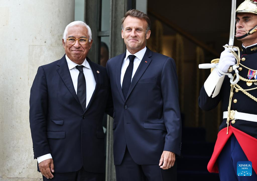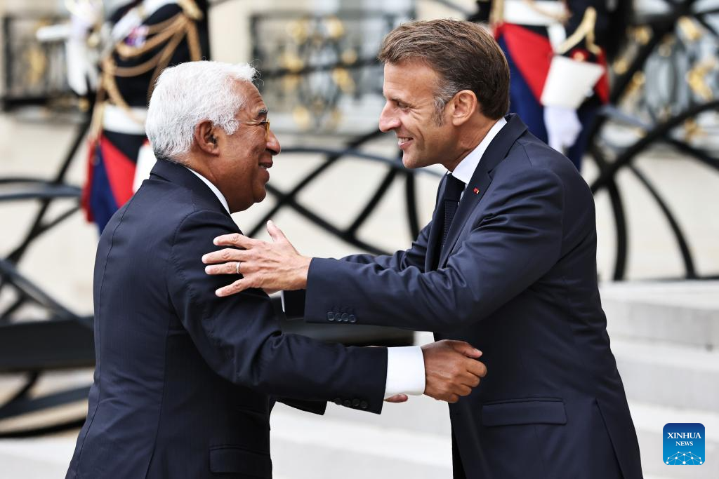 O presidente francês, Emmanuel Macron (direita), cumprimenta o presidente do Conselho Europeu, Antonio Costa, em sua chegada para participar da reunião da "’Coalizão dos Dispostos" no Palácio do Eliseu, em Paris, França, em 4 de setembro de 2025. Macron anunciou na quinta-feira que 26 países, a maioria europeus, se comprometeram formalmente a enviar tropas como parte de um futuro cessar-fogo russo-ucraniano, embora não diretamente na linha de frente. (Xinhua/Gao Jing)