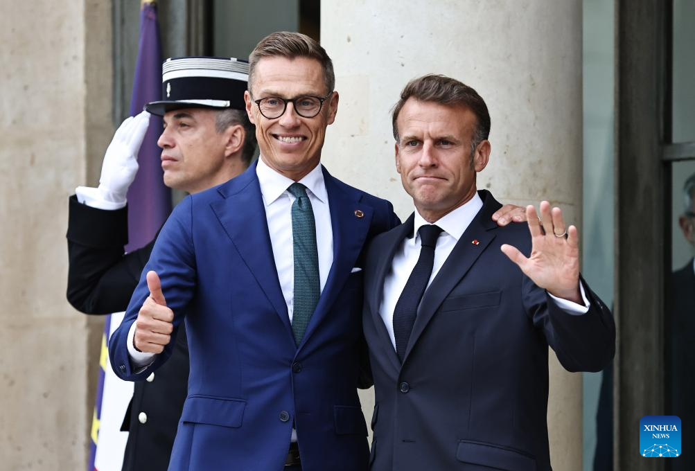 O presidente francês, Emmanuel Macron (direita), acena com o presidente finlandês, Alexander Stubb, em sua chegada para participar da reunião da "Coalizão dos Dispostos" no Palácio do Eliseu, em Paris, França, em 4 de setembro de 2025. Macron anunciou na quinta-feira que 26 países, a maioria europeus, se comprometeram formalmente a enviar tropas como parte de um futuro cessar-fogo russo-ucraniano, embora não diretamente na linha de frente. (Xinhua/Gao Jing)
