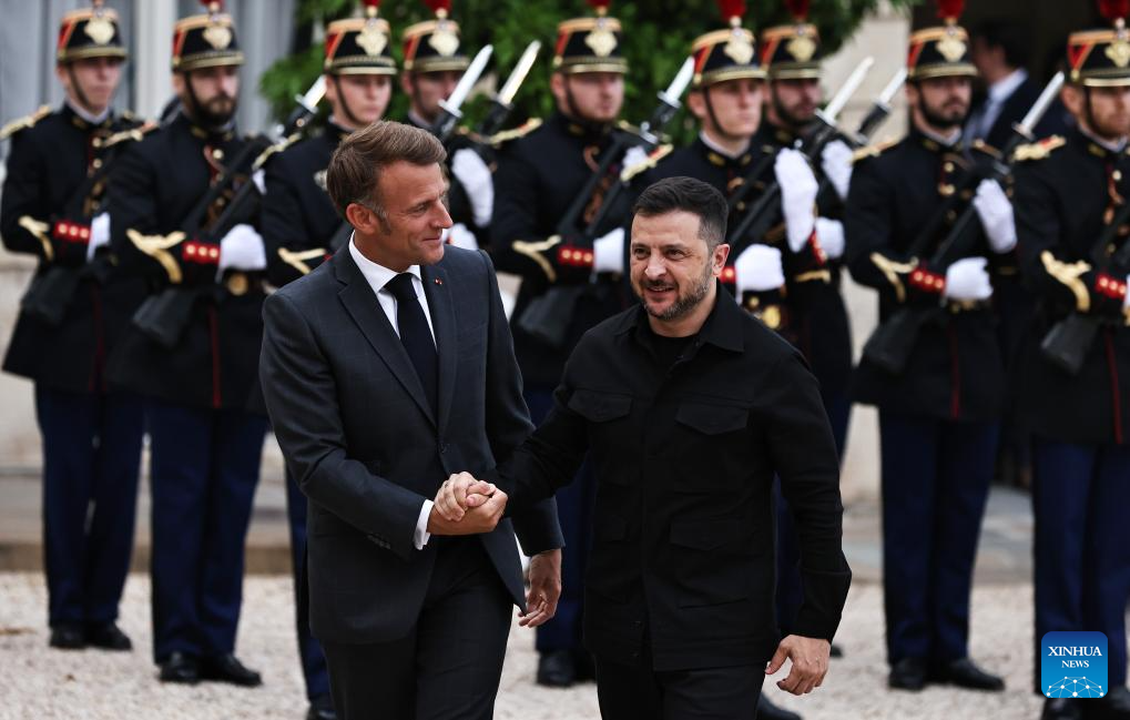 O presidente francês, Emmanuel Macron (direita), acena com o presidente ucraniano, Volodymyr Zelensky, em sua chegada para participar da reunião da "Coalizão dos Dispostos" no Palácio do Eliseu, em Paris, França, em 4 de setembro de 2025. Macron anunciou na quinta-feira que 26 países, a maioria europeus, se comprometeram formalmente a enviar tropas como parte de um futuro cessar-fogo russo-ucraniano, embora não diretamente na linha de frente. (Xinhua/Gao Jing)
