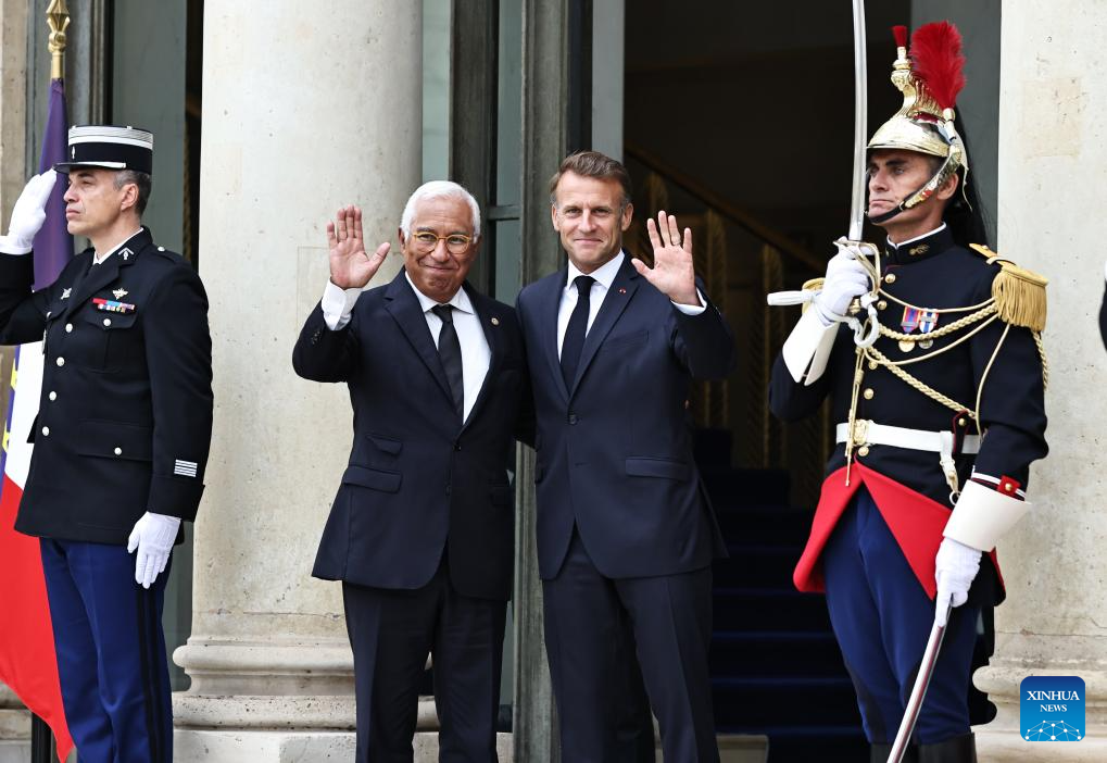 O presidente francês, Emmanuel Macron (2º à direita), acena com o presidente do Conselho Europeu, Antonio Costa (2º à esquerda), em sua chegada para participar da reunião da "Coalizão dos Dispostos" no Palácio do Eliseu, em Paris, França, em 4 de setembro de 2025. Macron anunciou na quinta-feira que 26 países, a maioria europeus, se comprometeram formalmente a enviar tropas como parte de um futuro cessar-fogo russo-ucraniano, embora não diretamente na linha de frente. (Xinhua/Gao Jing)