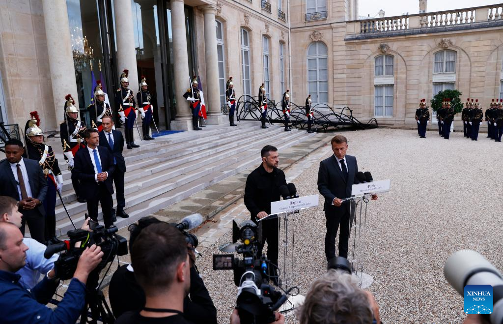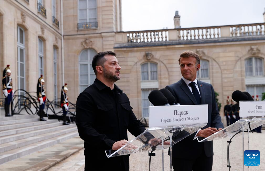 O presidente francês, Emmanuel Macron, (direita) e o presidente ucraniano, Volodymyr Zelensky, se encontram com a imprensa no Palácio do Eliseu, em Paris, França, em 3 de setembro de 2025. (Xinhua/Gao Jing)