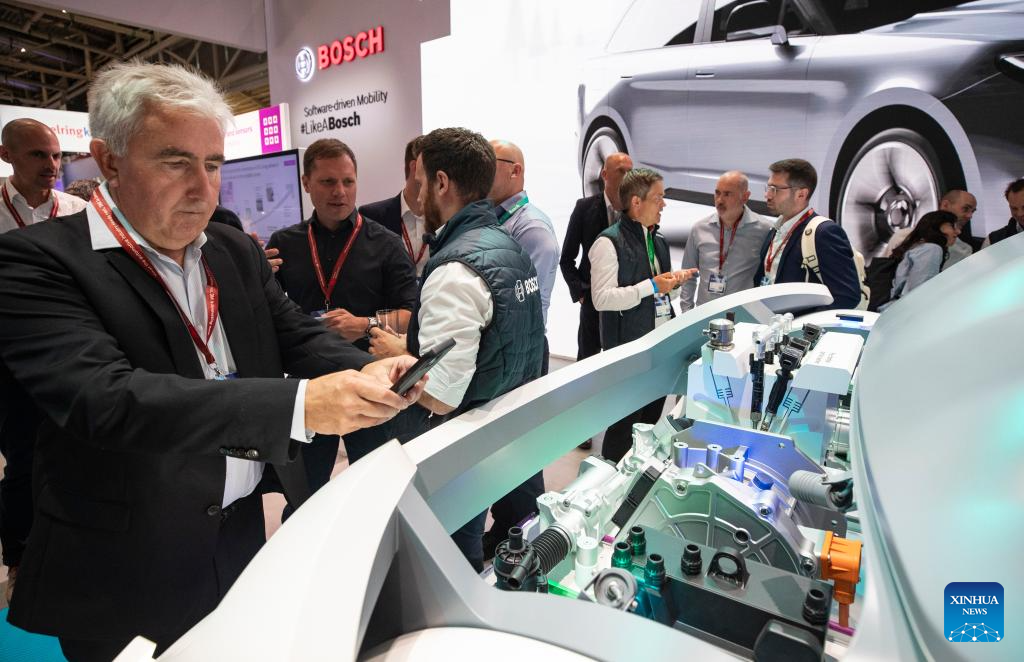 Pessoas visitam a área de exposição da Bosch na IAA Mobility 2025 em Munique, Alemanha, em 9 de setembro de 2025. A IAA Mobility 2025, uma das maiores feiras de mobilidade do mundo, começou na terça-feira, com montadoras e fornecedores globais apresentando veículos elétricos (EVs), direção autônoma e inovações baseadas em software. (Xinhua/Zhang Fan)