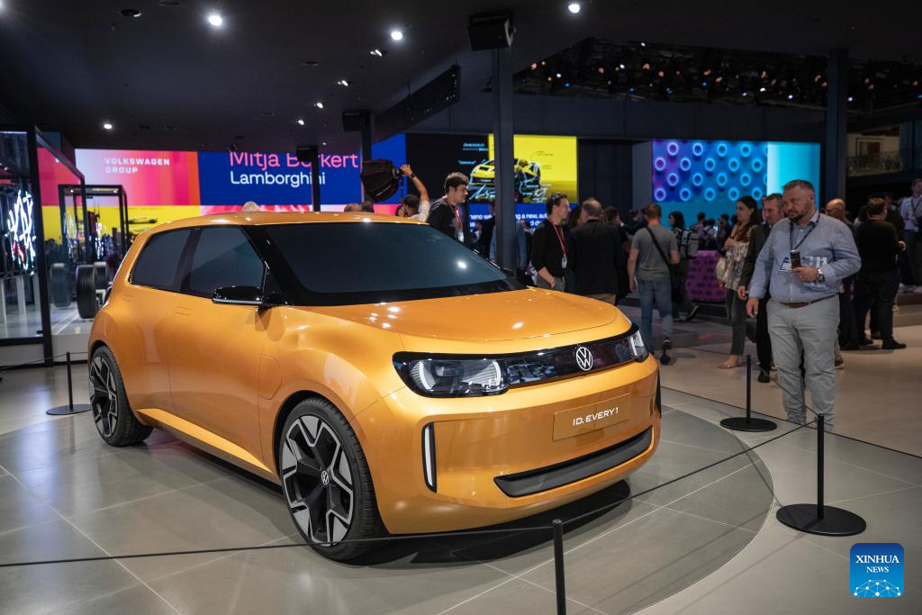 Pessoas observam um Volkswagen ID. EVERY1 na área de exposição da Volkswagen na IAA Mobility 2025 em Munique, Alemanha, em 9 de setembro de 2025. A IAA Mobility 2025, uma das maiores feiras de mobilidade do mundo, começou na terça-feira, com montadoras e fornecedores globais apresentando veículos elétricos (EVs), direção autônoma e inovações baseadas em software. (Xinhua/Zhang Fan)