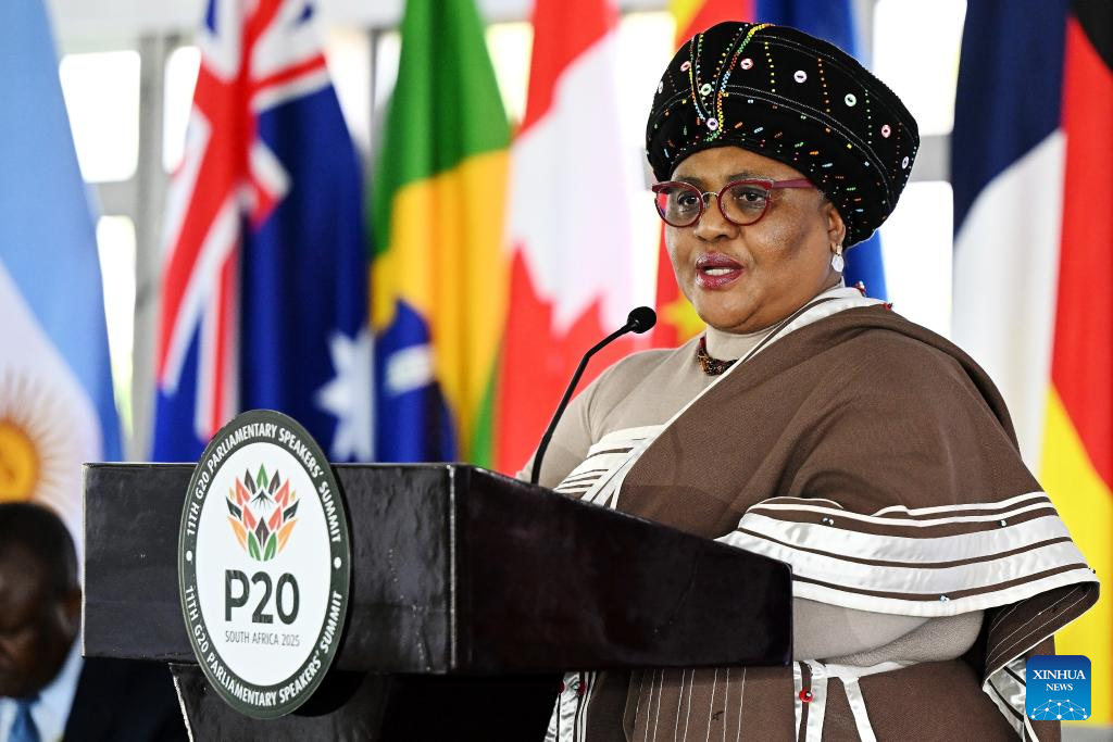 A presidente da Assembleia Nacional da África do Sul, Thoko Didiza, discursa na cerimônia de abertura da 11ª edição da Cúpula de Presidentes Parlamentares do G20 em Kleinmond, província do Cabo Ocidental, África do Sul, em 1º de outubro de 2025. A 11ª edição da Cúpula de Presidentes Parlamentares do Grupo dos 20 (G20) começou na quarta-feira na província do Cabo Ocidental, África do Sul, colocando a diplomacia parlamentar no centro das discussões. (Foto por Xabiso Mkhabela/Xinhua)