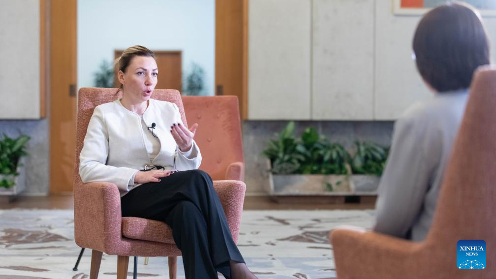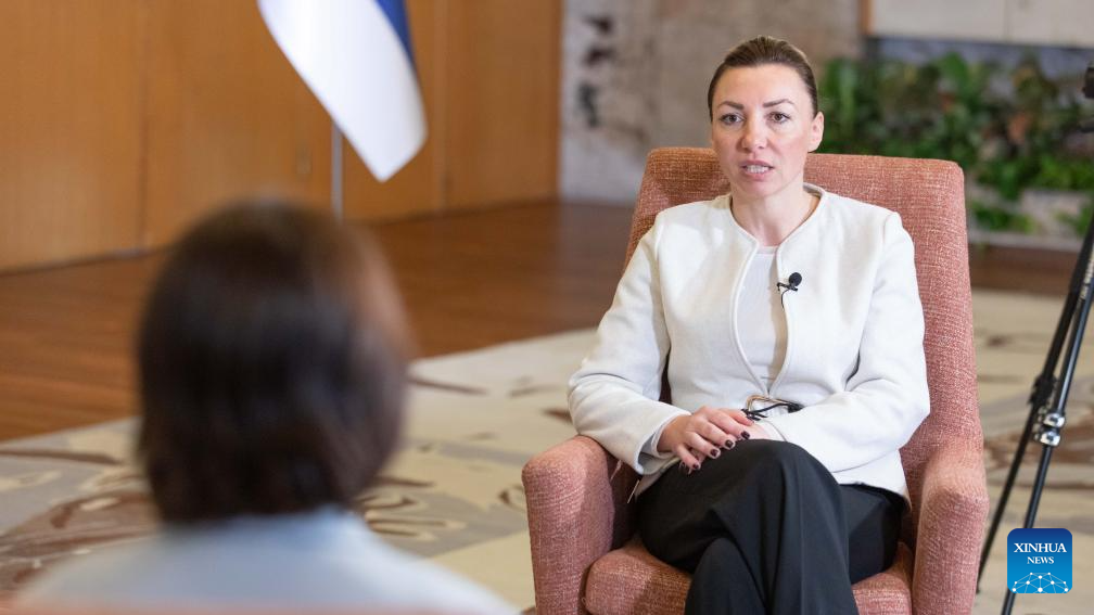 Tatjana Macura, ministra sem pasta da Sérvia responsável pela igualdade de gênero, prevenção da violência contra as mulheres e empoderamento econômico e político feminino, dá entrevista exclusiva à Xinhua em Belgrado, Sérvia, em 2 de outubro de 2025. (Foto por Wang Wei/Xinhua)