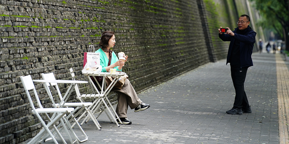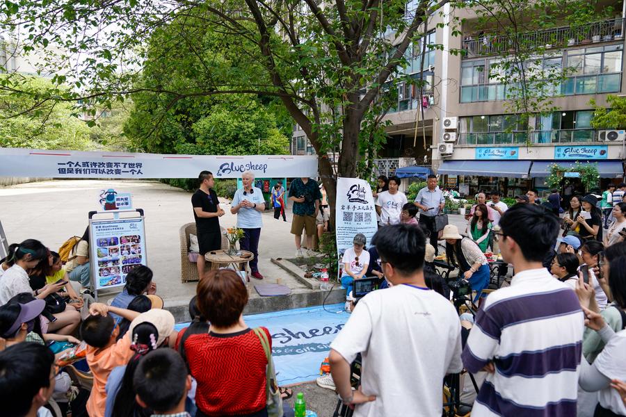 Rachel Grace Pinniger (centro à direita, atrás) conta história de sua vida em Chengdu, Província de Sichuan, sudoeste da China, em 19 de abril de 2025. (Xinhua/Xu Bingjie)