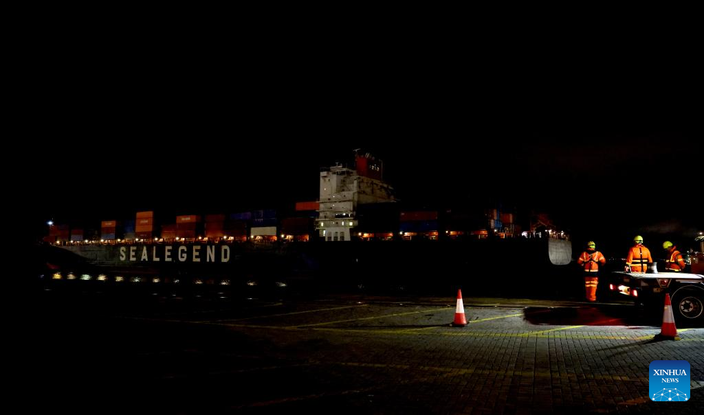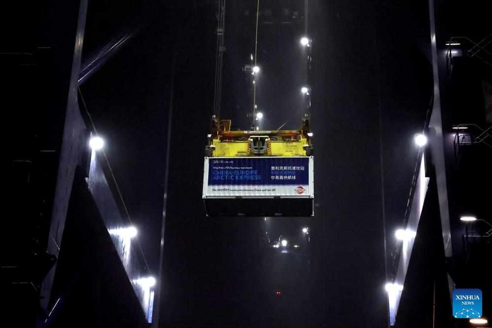 Felixstowe, Reino Unido, 14 out (Xinhua) -- Após uma viagem de 20 dias, o primeiro navio da rota expressa de contêineres do Ártico China-Europa chegou na noite de segunda-feira ao Porto de Felixstowe, no leste da Inglaterra.