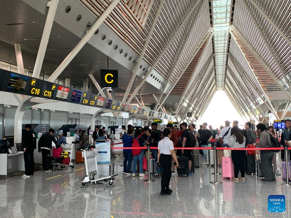 Passageiros em fila para fazer o check-in no Aeroporto Internacional de Siem Reap-Angkor, na província de Siem Reap, Camboja, em 16 de outubro de 2025. O Aeroporto Internacional Siem Reap-Angkor (SAI), com investimento chinês, comemorou na quinta-feira o segundo aniversário de suas operações. (Foto por Van Pov/Xinhua)