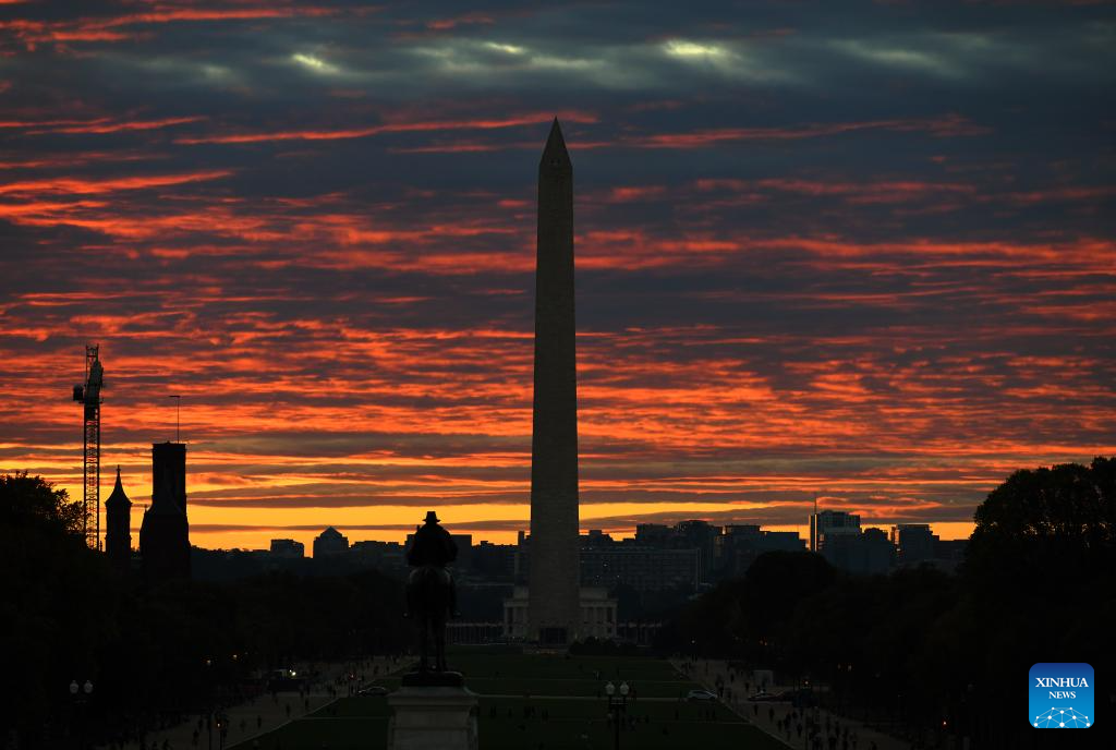 Silhueta do Monumento a Washington contra o pôr do sol em Washington, D.C., Estados Unidos, em 15 de outubro de 2025. (Xinhua/Li Rui)