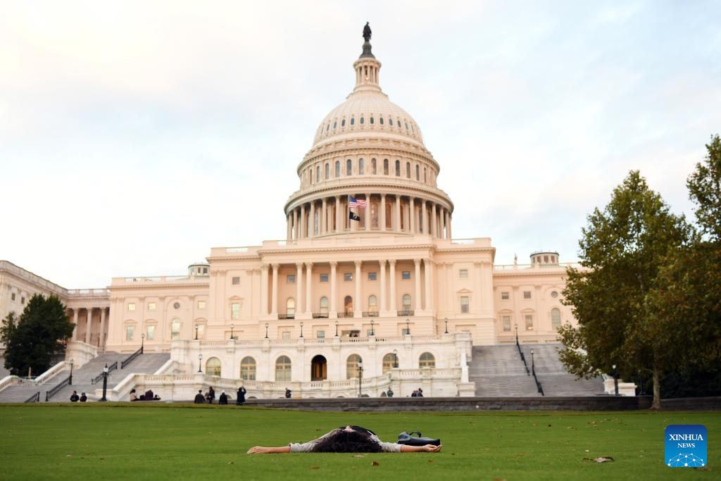 Mulher deitada em gramado em frente ao Capitólio dos EUA em Washington, D.C., Estados Unidos, em 15 de outubro de 2025. (Xinhua/Li Rui)