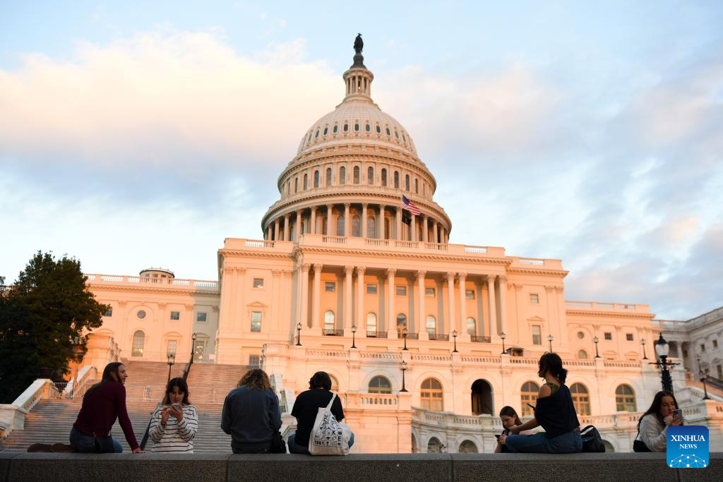 Pessoas passam tempo em frente ao Capitólio dos EUA ao pôr do sol em Washington, D.C., Estados Unidos, em 15 de outubro de 2025. (Xinhua/Li Rui)