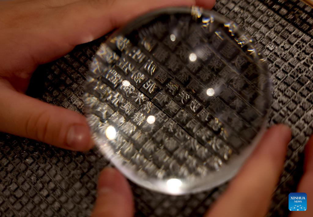 Visitante observa caracteres chineses de aço para máquinas de escrever chinesas na exposição "Hanzi do Ocidente, Letras do Oriente" em Londres, Reino Unido, em 22 de novembro de 2025.