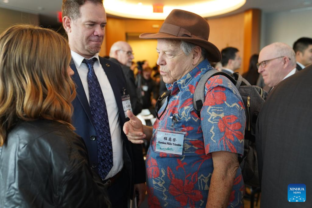 Adam Foster (2º à esquerda), fundador e presidente emérito da Fundação Helen Foster Snow, e sua filha (1ª à esquerda) conversam com Gordon Trimble (2º à direita), que recebeu o título "Amigo de Kuliang" e também venceu o Prêmio de Amizade do Governo Chinês, no Fórum Kuliang 2025 em Nova York, Estados Unidos, em 25 de novembro de 2025. (Xinhua/Zhang Fengguo)