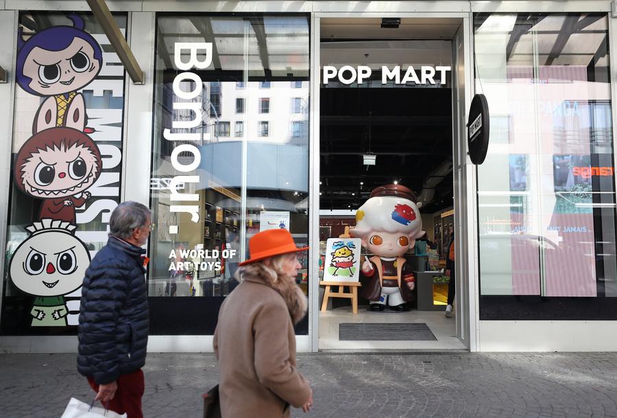 Pessoas caminham em frente à loja oficial da Pop Mart em Paris, França, em 1º de março de 2023. (Xinhua/Gao Jing)