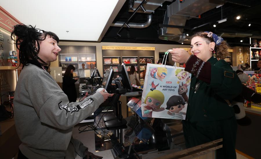 Clientes fazem compras na loja oficial da Pop Mart em Paris, França, em 1º de março de 2023. (Xinhua/Gao Jing)