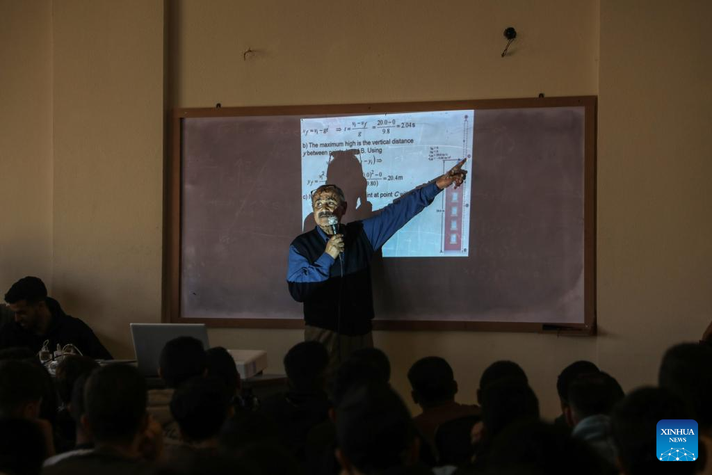 Professor dá aula na Universidade Islâmica, na Cidade de Gaza, em 7 de dezembro de 2025. (Foto por Rizek Abdeljawad/Xinhua)