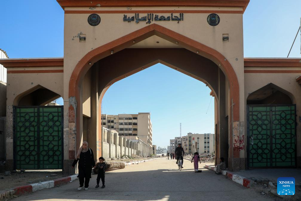 Estudantes palestinos caminham pelo campus da Universidade Islâmica, na Cidade de Gaza, em 7 de dezembro de 2025. (Foto por Rizek Abdeljawad/Xinhua)