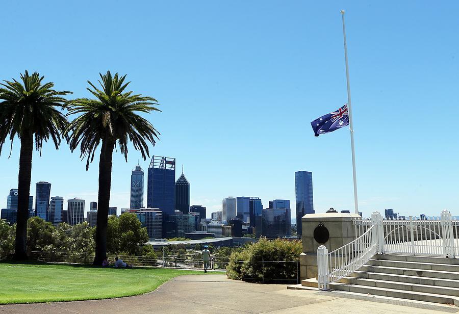 Bandeira nacional australiana hasteada a meio mastro no Kings Park, em Perth, Austrália, em 15 de dezembro de 2025. (Foto por Zhou Dan/Xinhua)