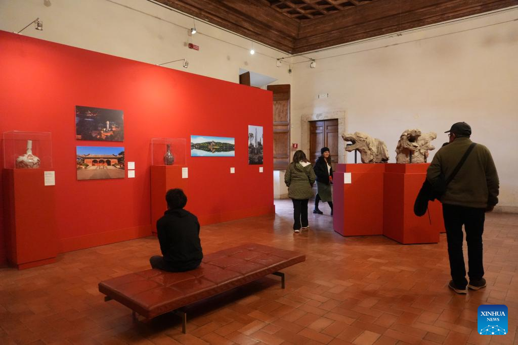 Visitantes observam a exposição "Harmonia entre a Humanidade e a Natureza: O Palácio de Verão na Villa d'Este", na Villa d'Este, em Tivoli, Itália, em 16 de dezembro de 2025. A exposição conjunta foi inaugurada em 3 de dezembro na Villa d'Este, perto de Roma, e ficará em cartaz até 5 de abril de 2026. Ela marca a primeira exposição colaborativa desde que o Palácio de Verão e a Villa d'Este assinaram um acordo de parceria entre a China e a Itália para o Patrimônio Mundial, em novembro de 2024. (Xinhua/Zhang Xinwen)