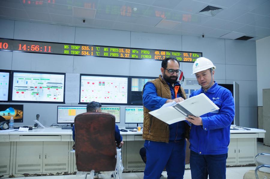 Funcionários da China e do Iraque verificam o funcionamento das unidades geradoras da Usina Termoelétrica de Wasit, na província de Wasit, Iraque, em 10 de fevereiro de 2025. Construída e mantida pelo Grupo Elétrico de Shanghai, a Usina Termoelétrica de Wasit gera eletricidade para dezenas de milhares de famílias, trazendo uma luz de esperança para o país devastado pela guerra. (Xinhua/Duan Minfu)