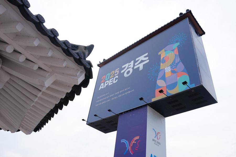 Foto tirada em 31 de outubro de 2025 mostra painel publicitário da 32ª Reunião de Líderes Econômicos da Cooperação Econômica Ásia-Pacífico (APEC) em Gyeongju, Coreia do Sul, em 31 de outubro de 2025. (Xinhua/Jia Haocheng)