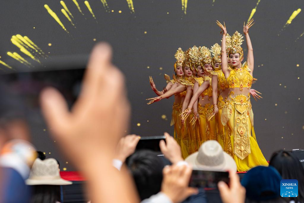 O evento, que durou o dia todo e foi realizado no Shopping Two Rivers, contou com apresentações culturais como danças do dragão e do leão, música contemporânea e mostras de trajes e culinária chinesa. (Xinhua/Liu Qiong)