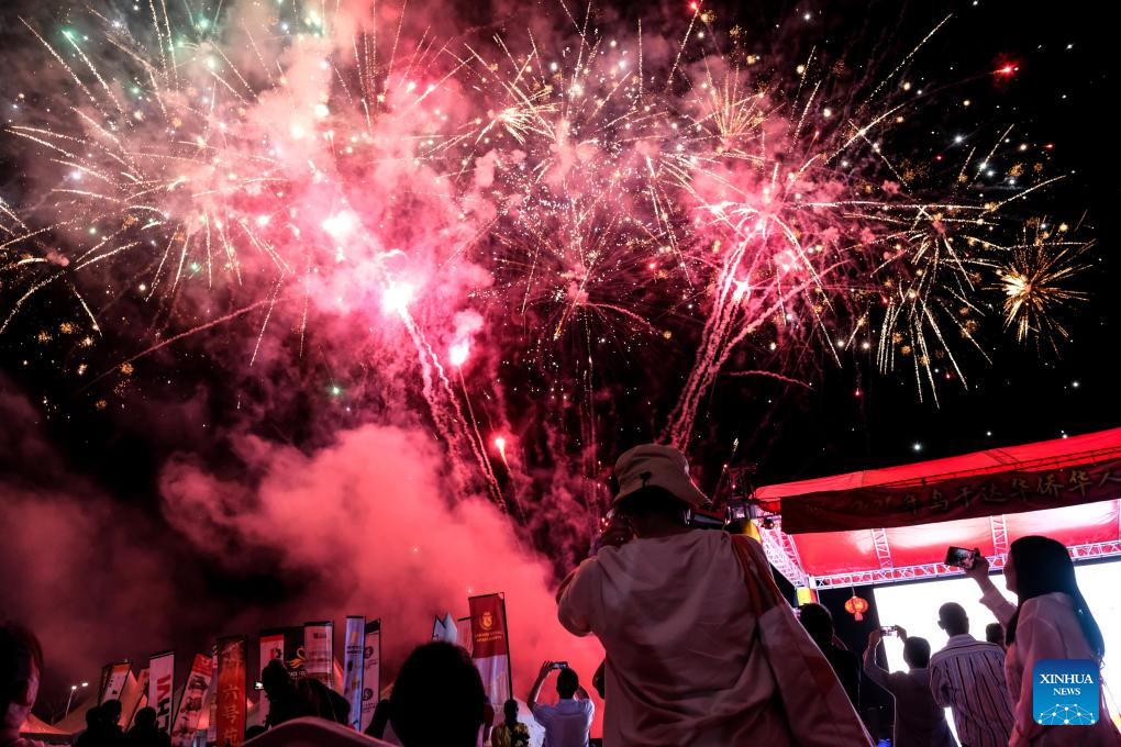 Pessoas filmam fogos de artifício com celulares durante uma feira em um templo para marcar o lançamento do Ano de Intercâmbio Interpessoal China-Uganda e celebrar o Ano Novo Chinês em Campala, Uganda, em 8 de fevereiro de 2026. Uganda lançou o Ano de Intercâmbio Interpessoal China-Uganda no domingo, na capital, Campala, durante uma feira em um templo realizada para celebrar o Ano Novo Chinês, também conhecido como Festa da Primavera. (Foto de Hajarah Nalwadda/Xinhua)