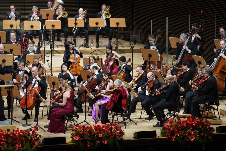 Músicos se apresentam em um concerto para comemorar o Ano Novo Chinês pela Filarmônica de Nova York em Nova York, Estados Unidos, em 25 de fevereiro de 2026. (Xinhua/Zhang Fengguo)