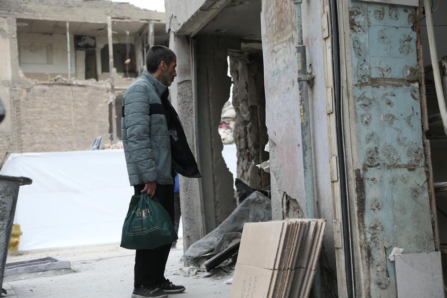 Homem em frente a um prédio destruído em uma área residencial de Teerã, Irã, em 15 de março de 2026. (Xinhua/Shadati)