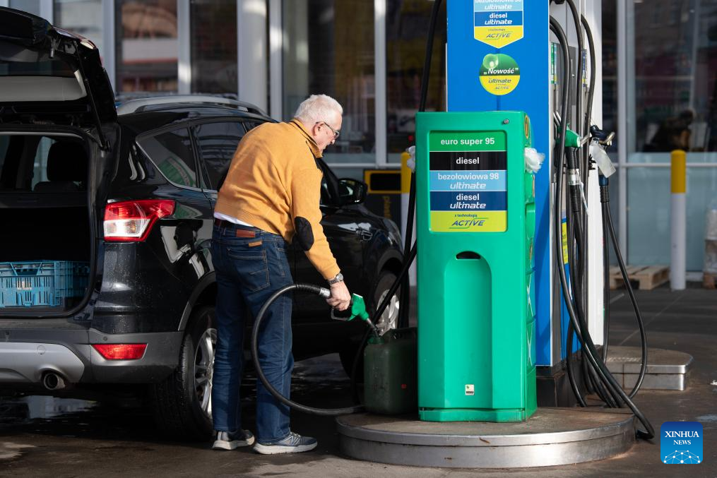 Motorista alemã abastece carro em um posto de gasolina em Slubice, Polônia, em 16 de março de 2026. (Xinhua/Zhang Haofu)