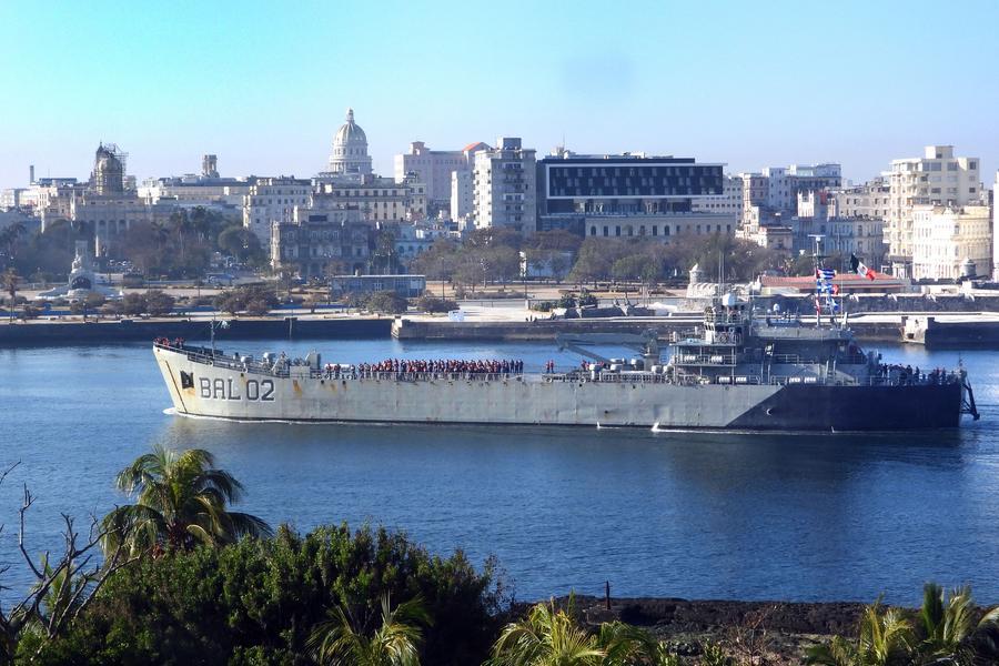 Navio transportando suprimentos de ajuda humanitária do México é visto no porto de Havana, Cuba, em 12 de fevereiro de 2026. (Foto de Joaquín Hernández/Xinhua)