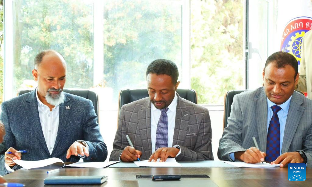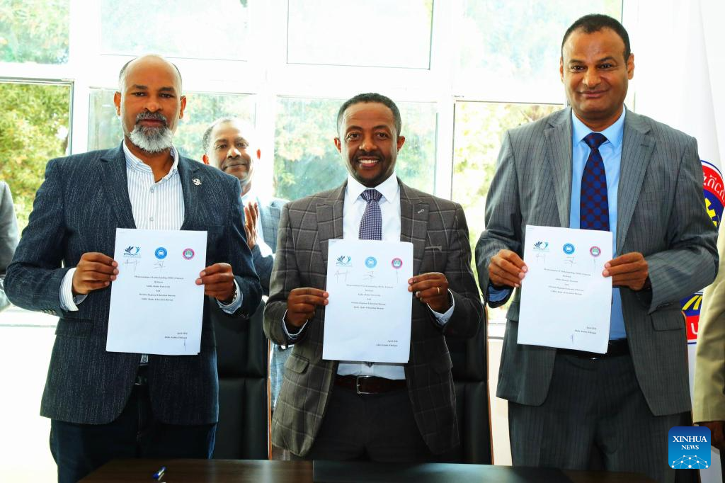 Foto tirada em 3 de abril de 2026 mostra cerimônia de assinatura de um memorando de entendimento entre a Universidade de Adis Abeba e os departamentos de educação de Adis Abeba e Oromia, em Adis Abeba, capital da Etiópia. (Universidade de Adis Abeba/Divulgação via Xinhua)