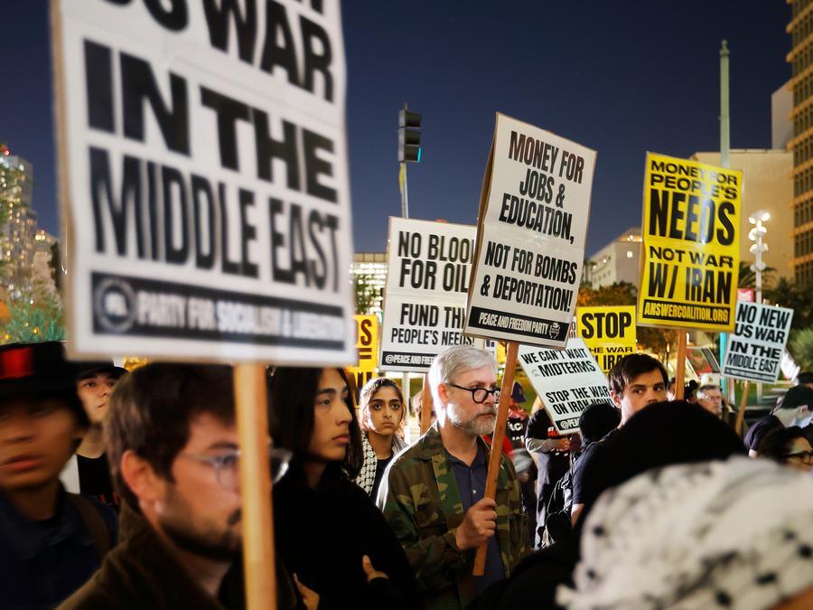 Pessoas protestam contra o ataque militar dos EUA ao Irã em Los Angeles, Estados Unidos, em 2 de março de 2026. (Xinhua)