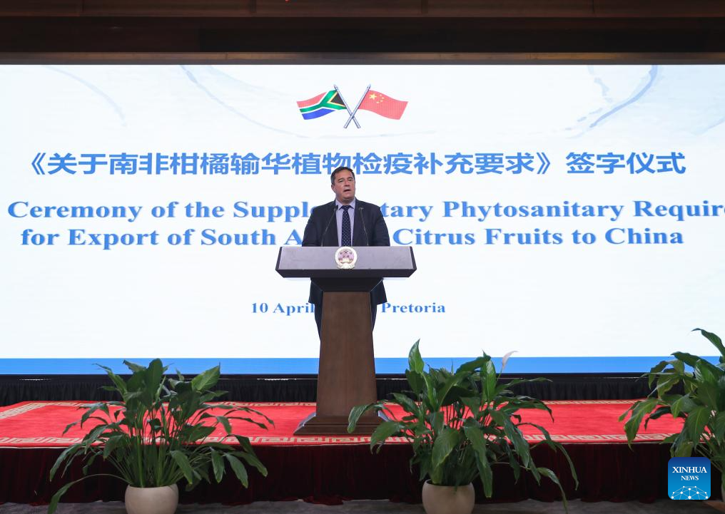 John Steenhuisen, ministro da Agricultura da África do Sul, discursa em uma cerimônia de assinatura na Embaixada da China em Pretória, África do Sul, em 10 de abril de 2026. Steenhuisen elogiou na sexta-feira a alteração dos requisitos de tratamento a frio que regulamentam a exportação de citrinos sul-africanos para a China, dizendo que a medida ajudará a expandir as oportunidades comerciais e a fortalecer a cooperação agrícola bilateral. (Xinhua/Chen Wei)