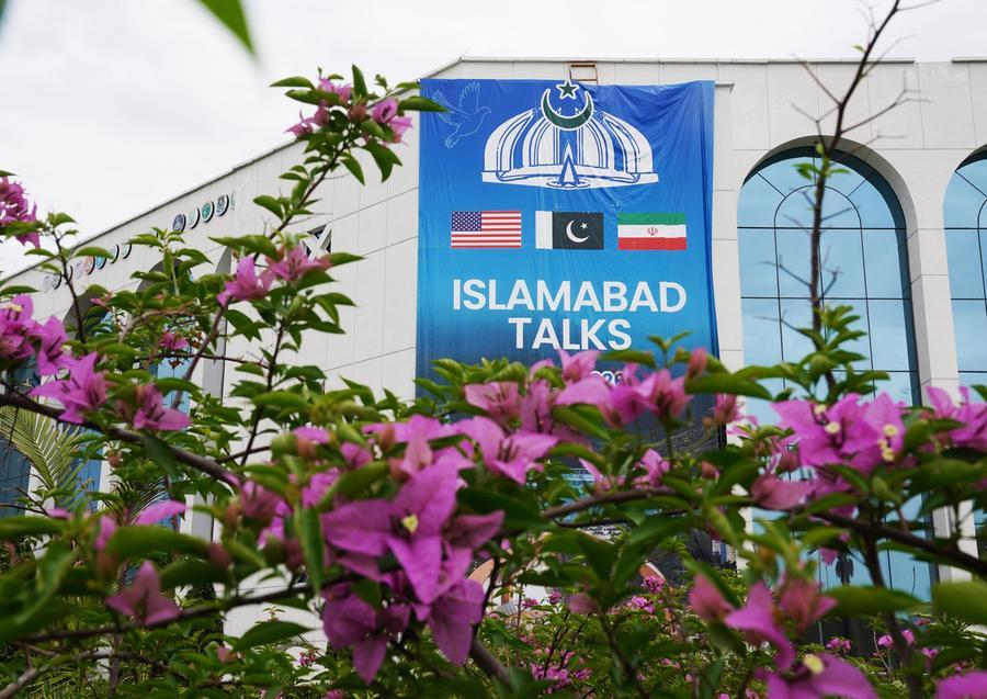 Foto tirada em 11 de abril de 2026 mostra vista externa do centro de imprensa para as negociações entre os Estados Unidos e o Irã em Islamabad, Paquistão. (Xinhua/Wang Shen)