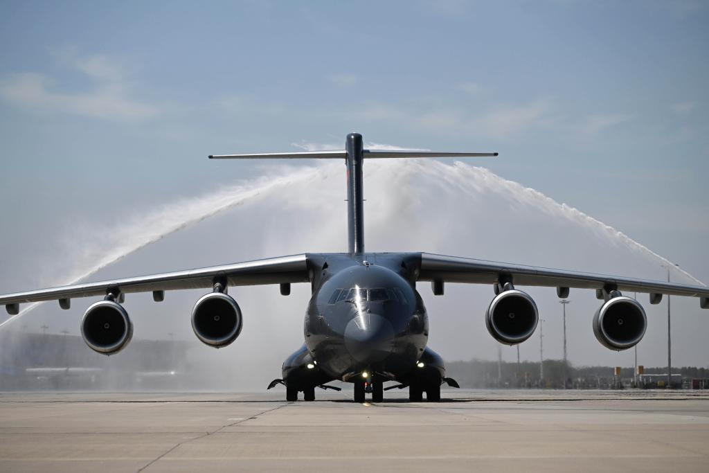Depois de entrar no espaço aéreo da China, a aeronave de transporte Y-20B foi escoltada por quatro caças J-20. Ao pousar no aeroporto, ela recebeu uma saudação de água em homenagem aos heróis caídos.