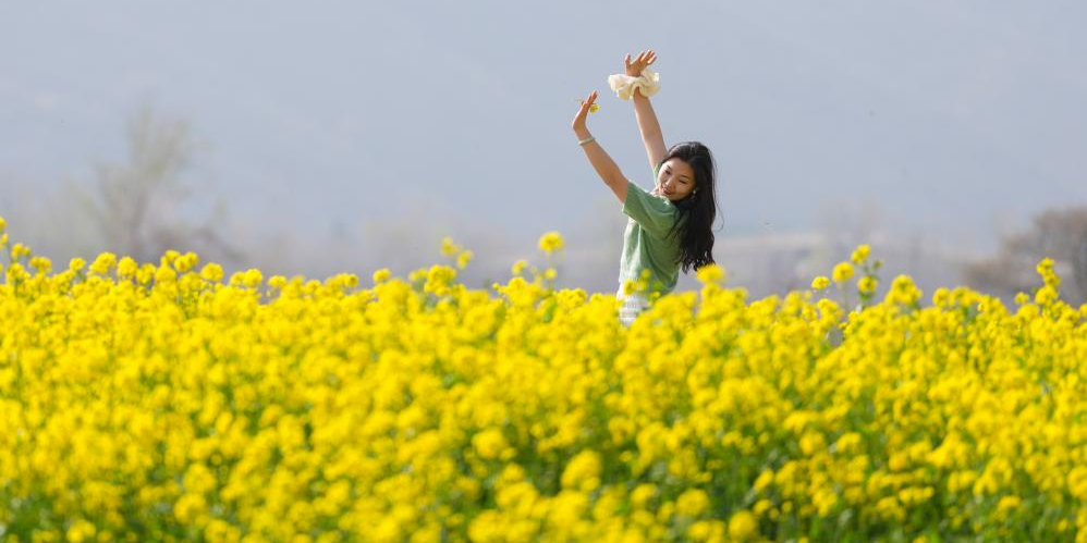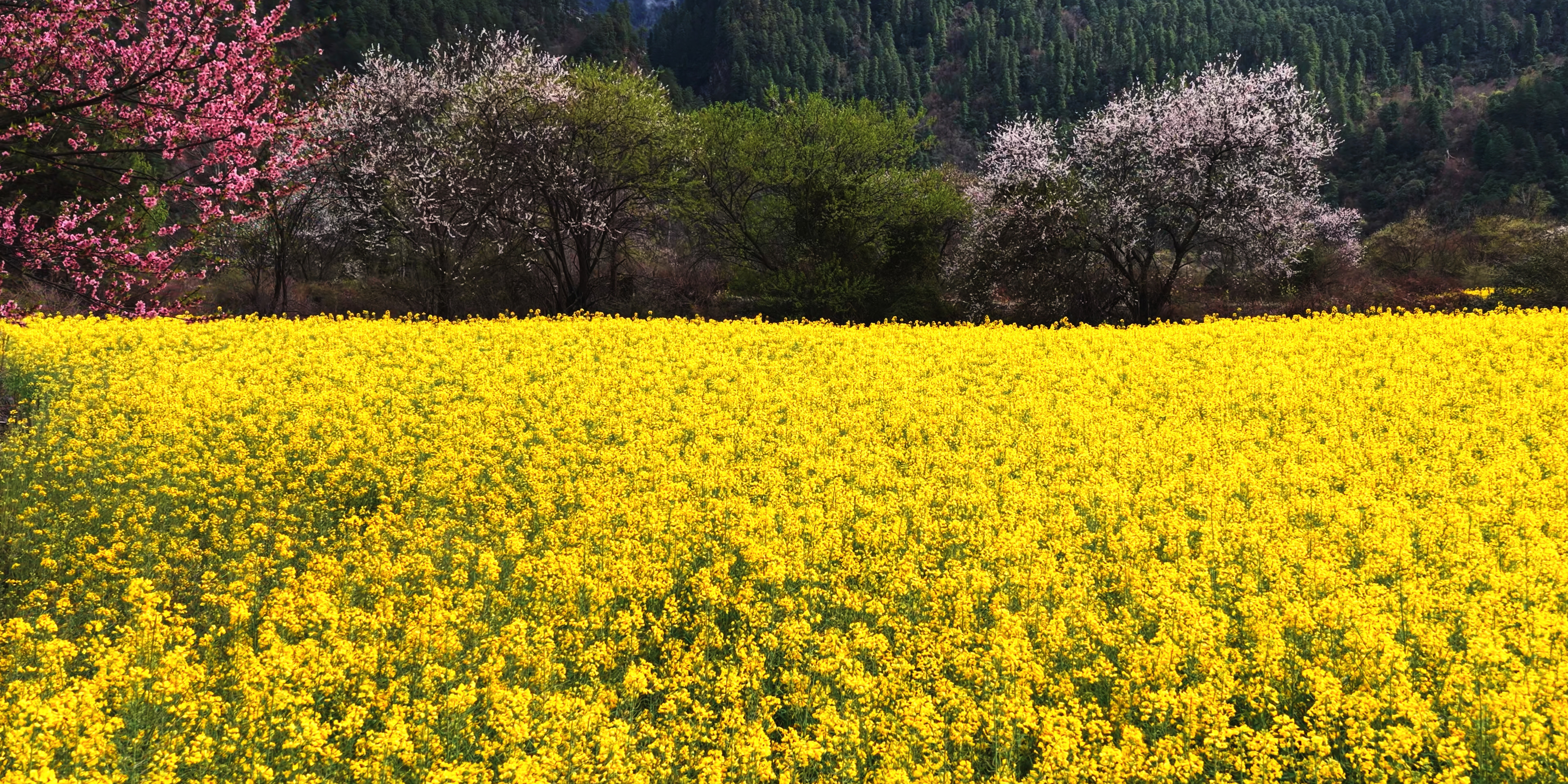 Canola e pessegueiros em floração embelezam paisagens do Distrito de Bomi, em Xizang, no sudoeste da China