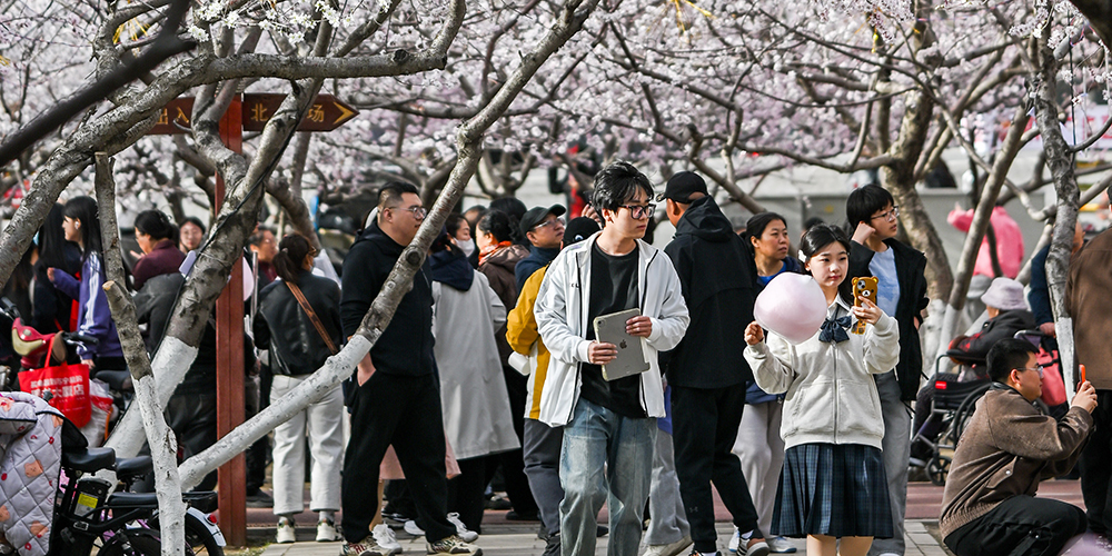 Turistas apreciam flores de pessegueiro em parque em Hohhot, na Mongólia Interior, norte da China