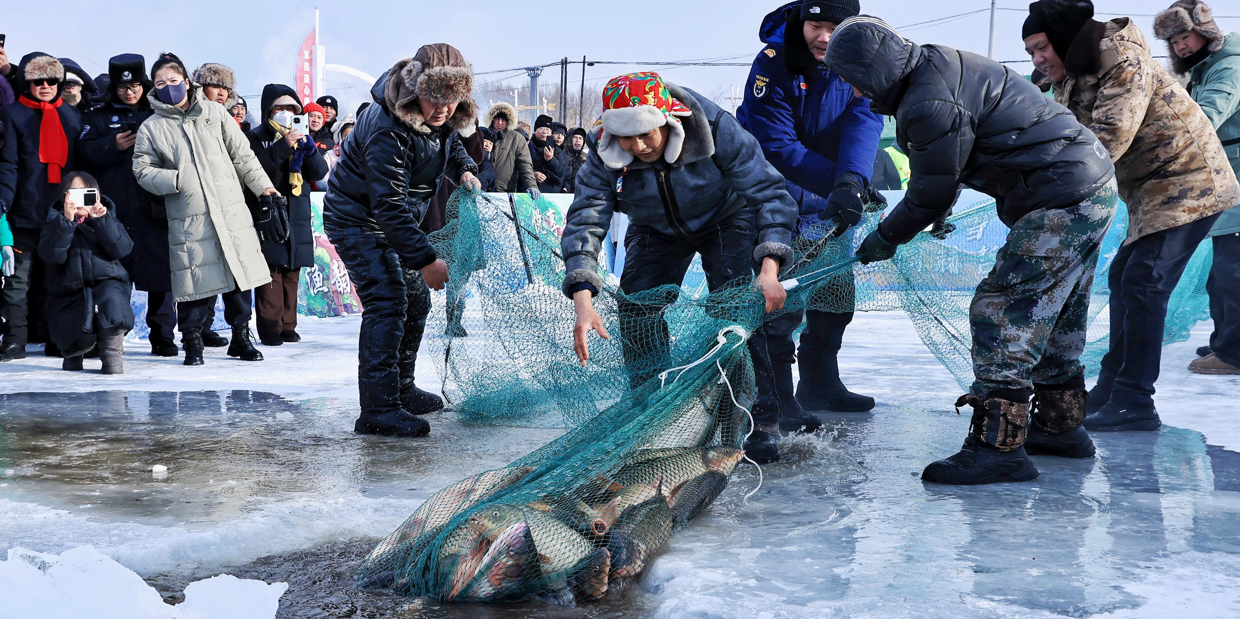 Festival de pesca no gelo atrai turistas na Vila da Etnia Hezhe de Jiejinkou, na Província de Heilongjiang