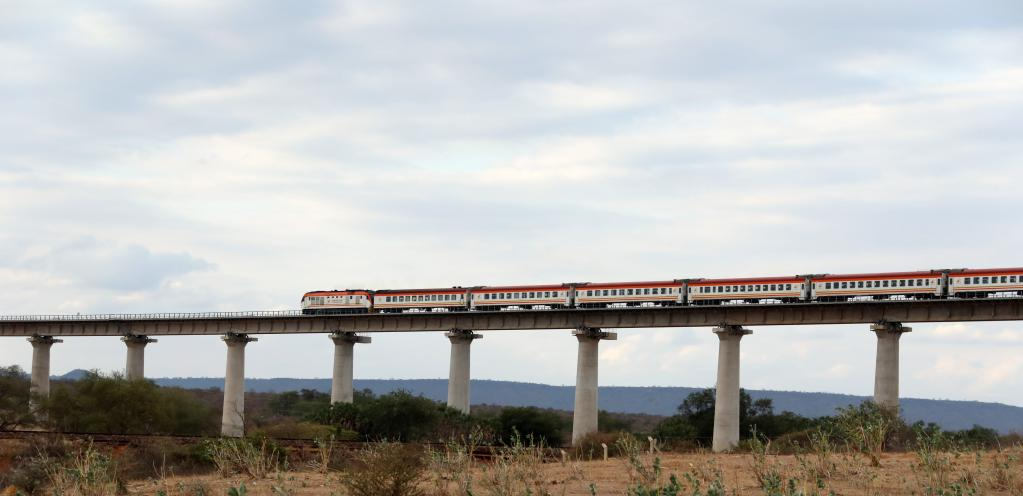 Um trem de passageiros passa pela Super Ponte sobre o Rio Tsavo, perto do Parque Nacional Tsavo, no Quênia, em 28 de julho de 2022. (Xinhua/Dong Jianghui)