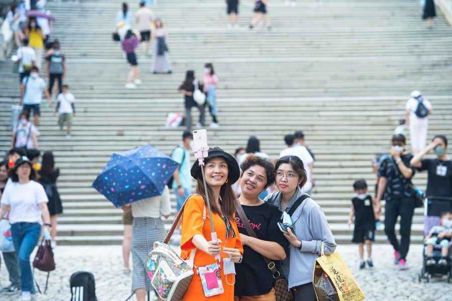 Visitantes tiram selfies nas Ruínas de São Paulo em Macau, sul da China, em 27 de agosto de 2022. (Xinhua/Cheong Kam Ka)
