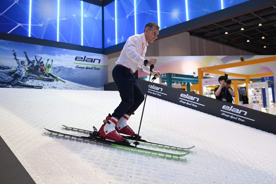 Delegado empresarial da Eslovênia usa equipamentos de esqui na Exposição China-PECO em Ningbo, província de Zhejiang, leste da China, no dia 16 de maio de 2023. (Xinhua/Huang Zongzhi)