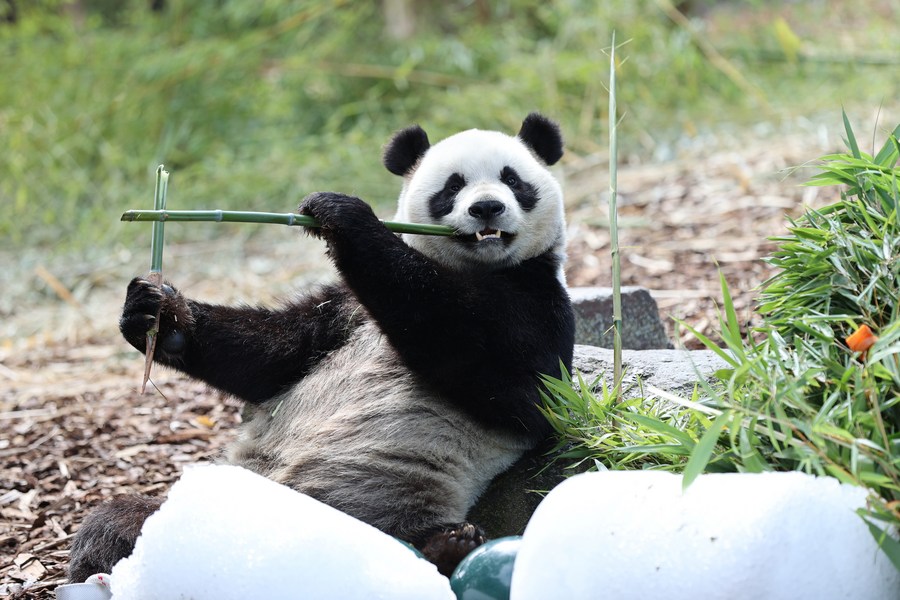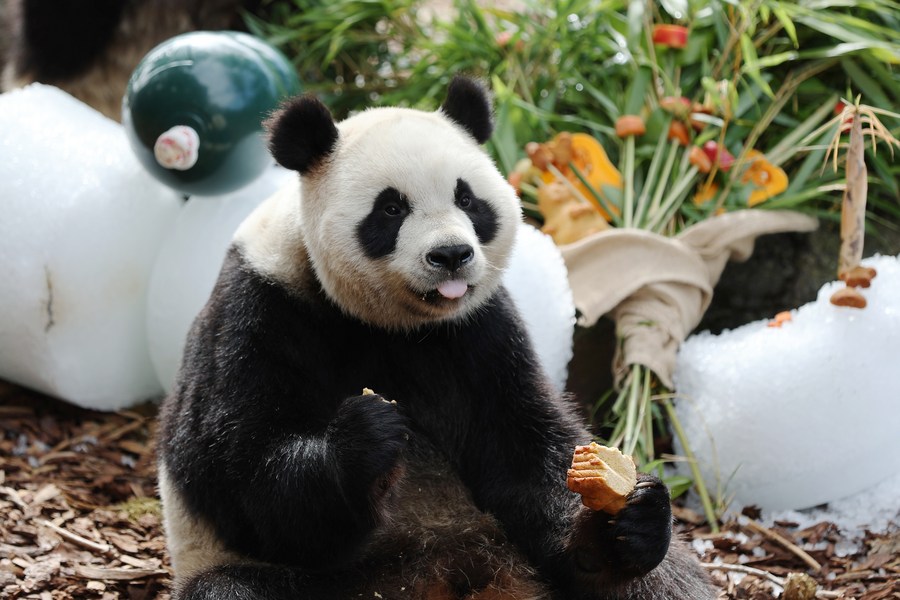 Panda gigante Bao Mei se alimenta no aniversário no zoológico Pairi Daiza em Brugelette, Bélgica, no dia 16 de agosto de 2023. A comemoração do quarto aniversário dos pandas gêmeos Bao Di e Bao Mei, nascidos em 8 de agosto de 2019, aconteceu no zoológico Pairi Daiza na quarta-feira. (Xinhua/Zhao Dingzhe)