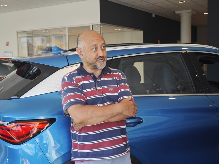 Foto de um cliente da BYD, Ben Malawau, foi tirada durante entrevista à Xinhua no showroom da BYD em Rotterdam, no dia 15 de agosto de 2023. (Liu Yuxuan/Xinhua)