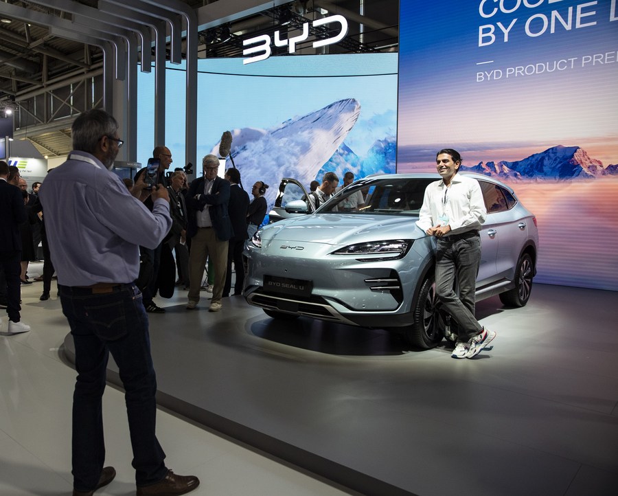 Visitante posa para fotos com um BYD SEAL U na prévia para imprensa do Salão Internacional do Automóvel de 2023, oficialmente conhecido como IAA MOBILITY 2023, em Munique, Alemanha, no dia 4 de setembro de 2023. (Xinhua/Zhang Fan)