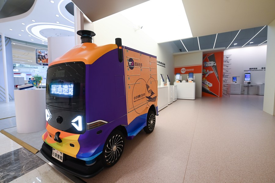 Transportadores logísticos inteligentes serão usadas no Principal Centro de Mídia durante os Jogos Asiáticos de Hangzhou. (Xinhua/Xu Yu)