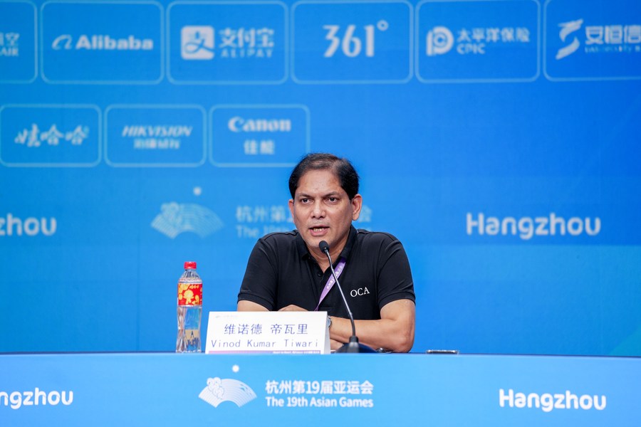 Vinod Kumar Tiwari, diretor-geral interino do Conselho Olímpico da Ásia (COA), em uma coletiva de imprensa em 18 de setembro de 2023. (Xinhua/Xue Yuge)