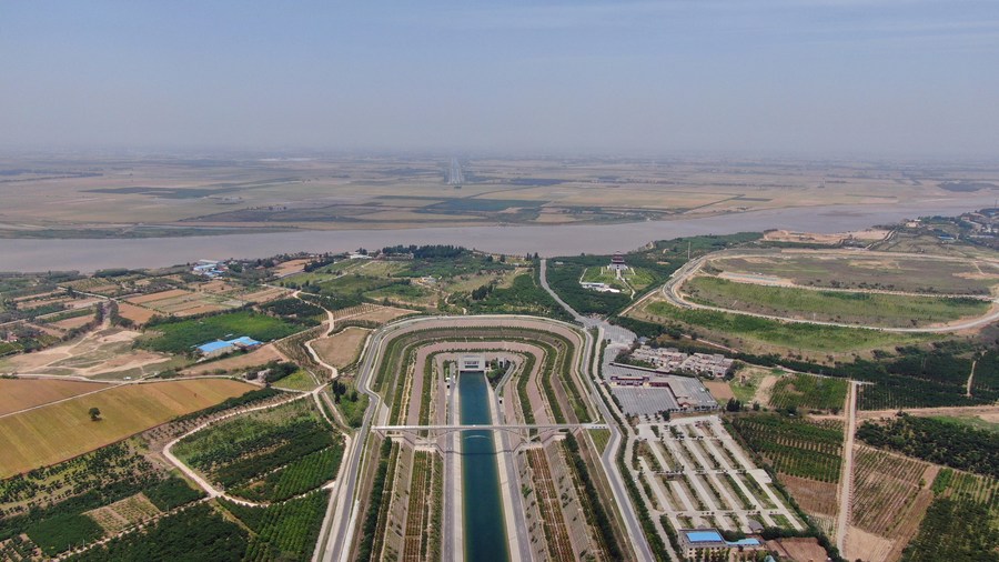 Foto aérea de 23 de maio de 2021 mostra um projeto da rota do meio do Projeto de Desvio de Água Sul-Norte da China atravessando o Rio Amarelo. (Xinhua/Liu Shiping)