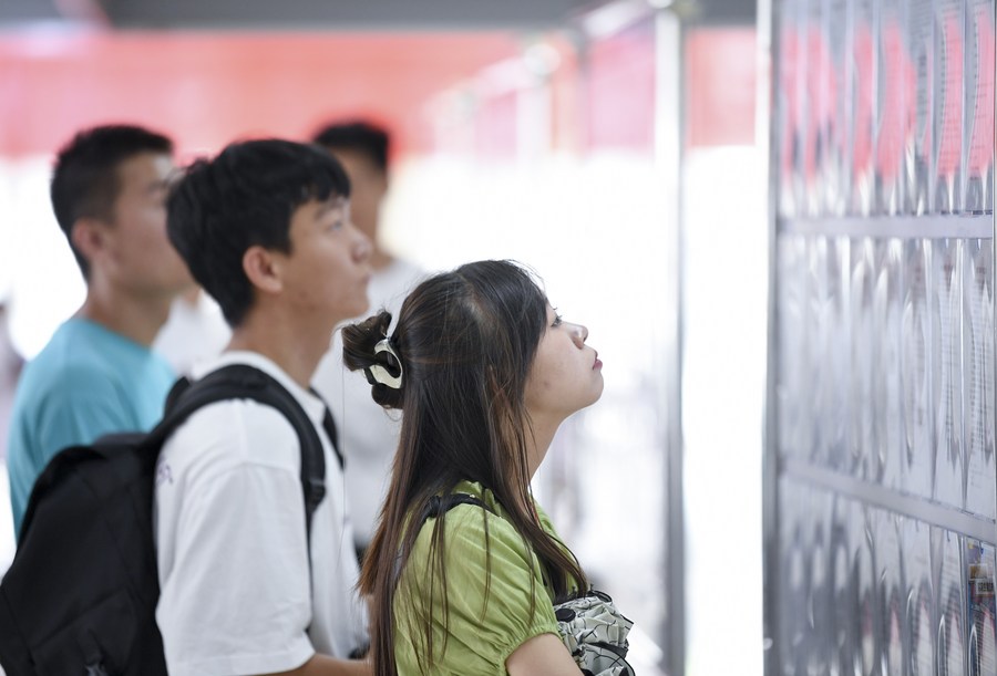 Pessoas à procura de emprego leem informações sobre recrutamento em uma feira de empregos em Yinchuan, capital da Região Autônoma da Etnia Hui de Ningxia, no noroeste da China, em 5 de agosto de 2023. (Xinhua/Feng Kaihua)